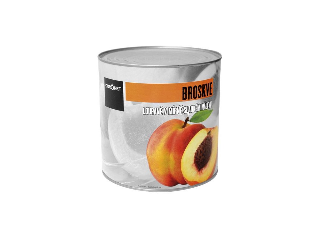 Půlky zralých broskví, zbavené slupek a pecek ve sladkém nálevu. Určeno k přímé konzumaci jako kompot. Vhodné též na pečení nebo do zmrzlinových pohárů. Nezpracovaný obsah je nutné umístit do nekovové uzavíratelné nádoby, skladovat v chladničce a spotřebovat do 24 hodin. Obsah s nálevem je 820 g, pevný podíl 470 g. Prodejní karton obsahuje 12 konzerv. Systém jednoduchého otevírání bez potřeby otvíráku na konzervy.Půlené loupané broskve, nálev (pitná voda, cukr, regulátor kyselosti: kyselina citrónová).