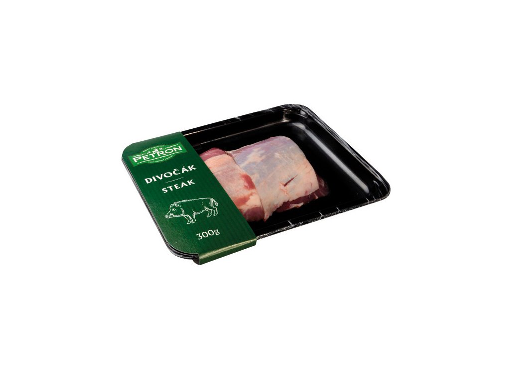 Steak z hřbetu divočáka ve skinovém balení. Chlazená dělená zvěřina Skladujte při teplotě od 0 °C do +4 °C. Po otevření spotřebujte do 24 hodin.