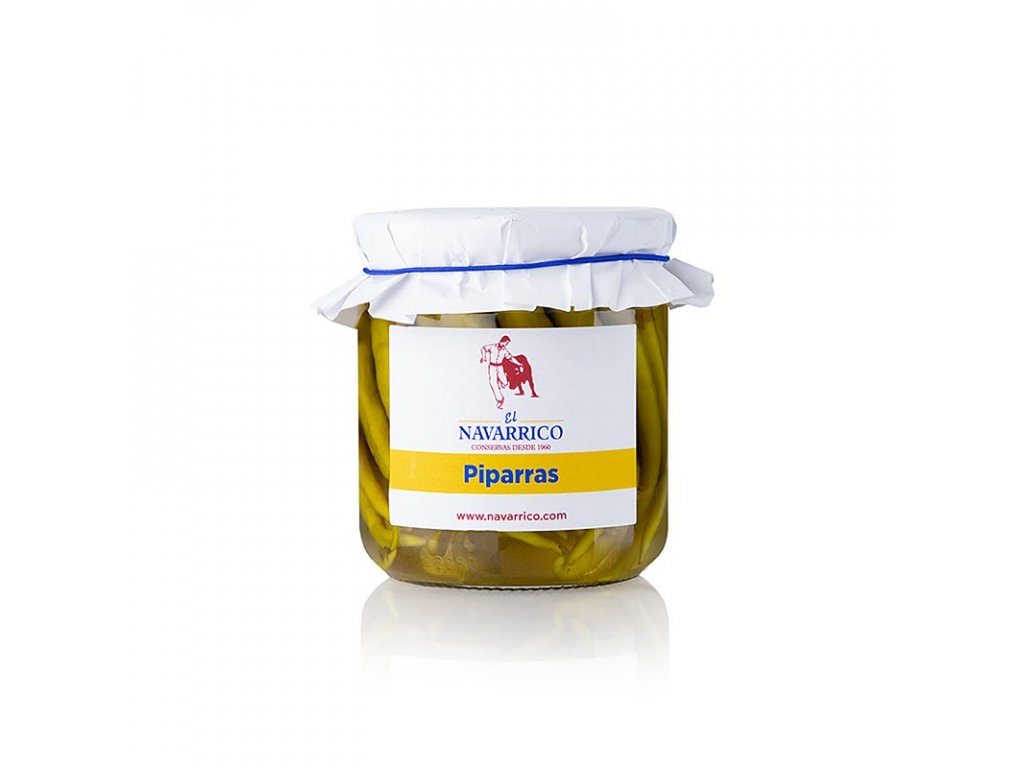 Piparra, jemné chilli papričky nakládané ve vinném octě. Složení: Piparras, voda, vinný ocet, sůl, regulátor kyselosti kyselina citrónová a antioxidant kyselina askorbová. Skladujte v chladu a suchu. Po otevření uchovávejte v chladničce a spotřebujte do 3 dnů. Odpovědný podnikatel: Distribuce: Cortes GourMed, Beerenstr. 5, 33803 Steinhagen, Německo. Prodejce v ČR: Toppotraviny.cz s.r.o., IČ: 24809594, DIČ: CZ24809594, Praha 5.
