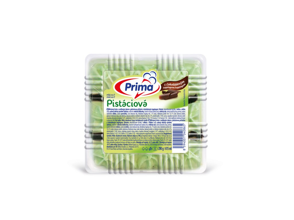 Mražený krém s rostlinným tukem s pistáciovou příchutí a čokoládovým toppingem.