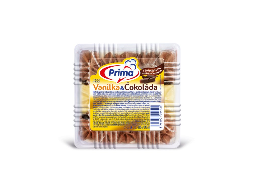 Mražený krém s rostlinným tukem s vanilkovou a čokoládovou příchutí a s čokoládovým toppingem.