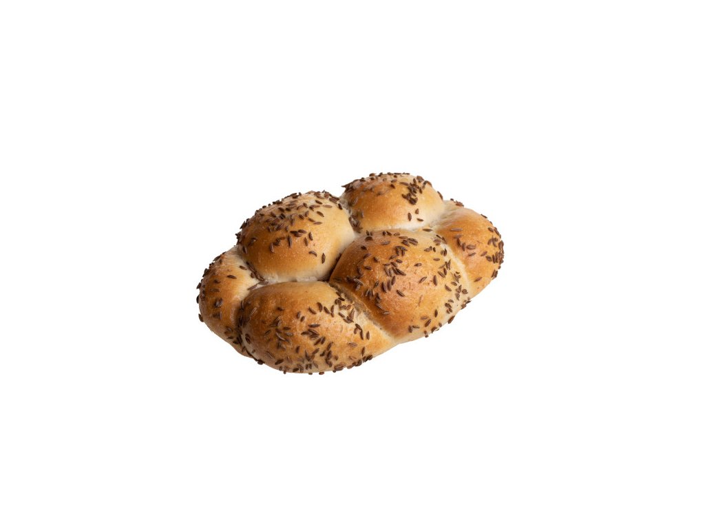 PŠENIČNÁ mouka, pitná voda, pekařské droždí, řepkový olej, jedlá sůl s jodem (jodičnan draselný), pekařský zlepšující přípravek (regulátor kyselosti: octan vápenatý, enzymy, látka zlepšující mouku: E300, E920, JEČNÝ sladový extrakt). Posyp: kmín.
