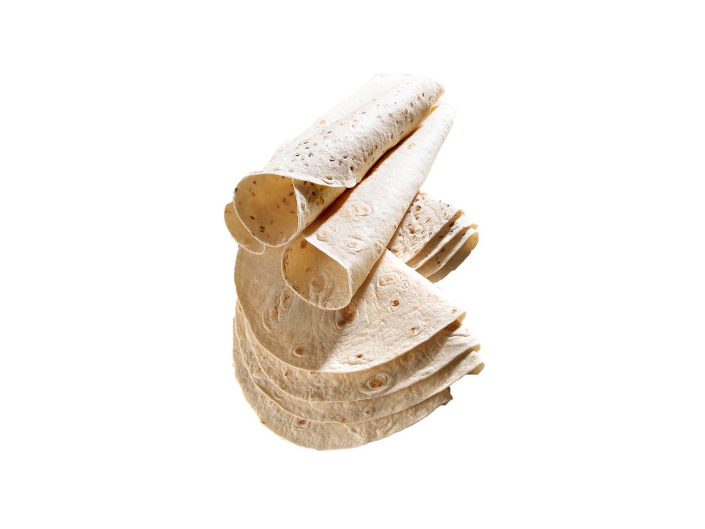 Pšeničné tortily 25 cm, hluboce zmrazené pečivo. V kartonu 8 sáčků po 18 tortillách. Celkem 144 tortil po 64 g.