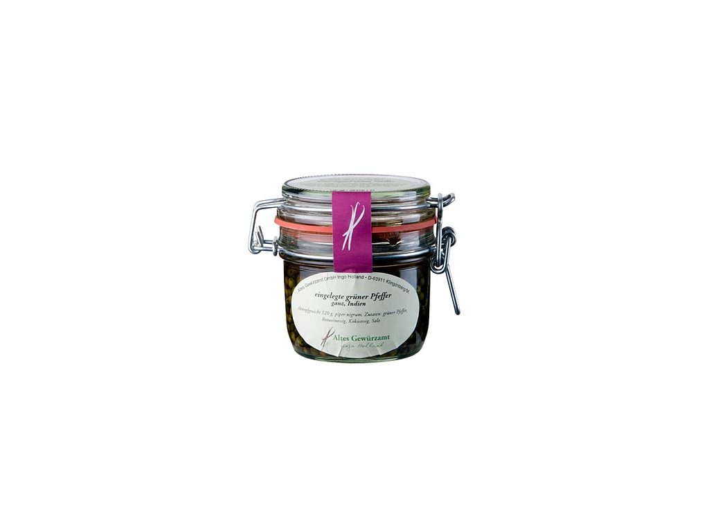 Ideální pro omáčky, ragú, marinády, ale také pro ovocné dezerty. Čistá hnotnost výrobku: 120g. Nakládaný zelený pepř, celý. Složení: zelený pepř, ocet z červeného vína, solanka (voda, 14% sůl, kokosový ocet). 5% kyselina. Odpovědní podnikatelé: Altes Gewürzamt GmbH Ingo Holland, Unterlandstr. 50, 63911 Klingenberg, Německo. Prodejce v ČR: Toppotraviny.cz s.r.o., IČ: 24809594, DIČ: CZ24809594, Praha 5.